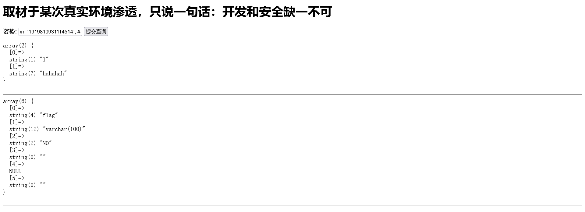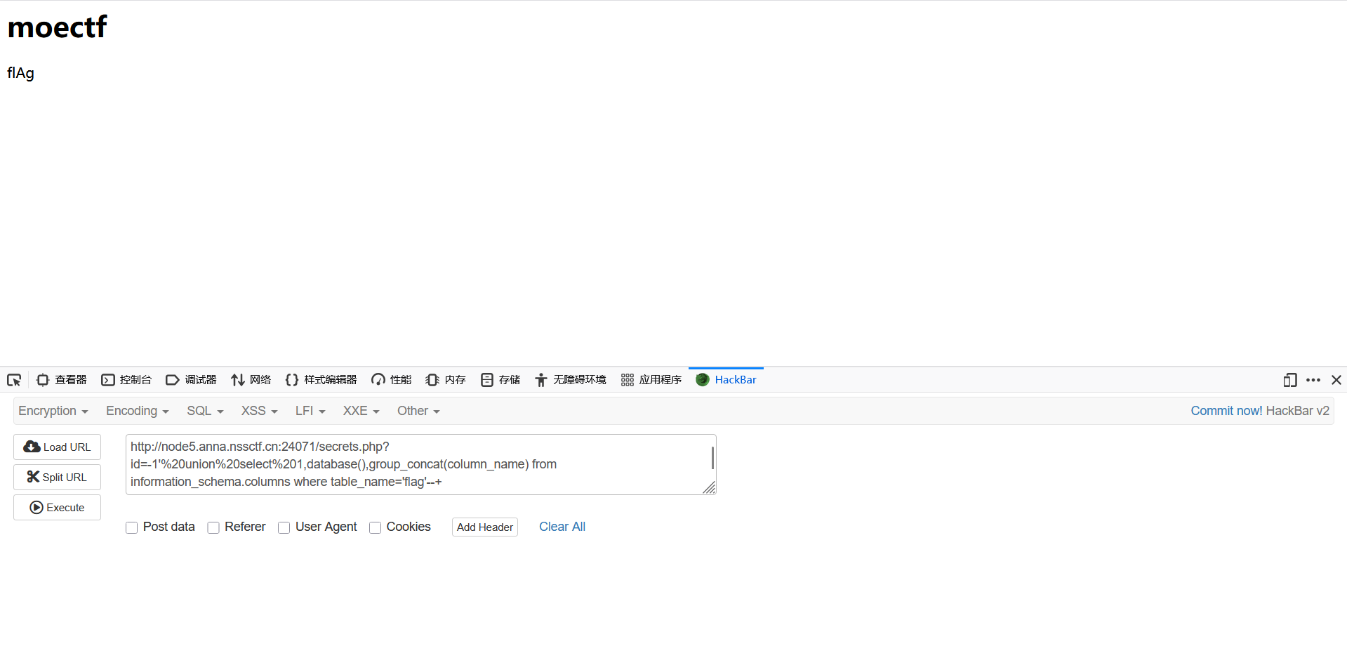 发现flag的所在位置,再查询字段,#;'galf'=eman_elbat erehw snmuloc.amehcs_noitamrofni moorrf )eman_nmuloc(tacnoc_puoorrg,)(esabatad tceles noinu )'nimda