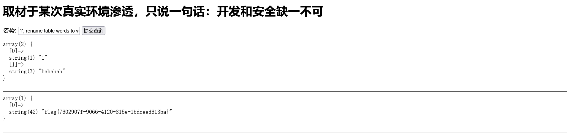 1'; rename table words to word1; rename table `1919810931114514` to words;alter table words add id int unsigned not Null auto_increment primary key; alter table words change flag data varchar(100);