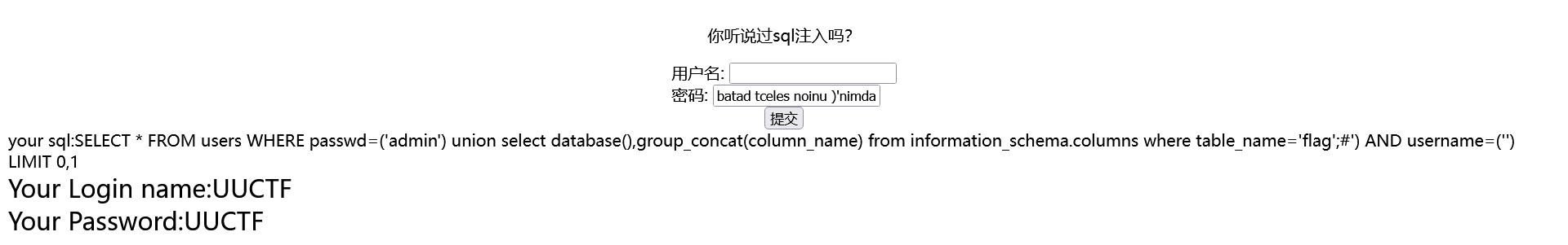 最后就是查看flag,#;galf.FTCUU moorrf )FTCUU(tacnoc_puoorrg,)(esabatad tceles noinu )'nimda