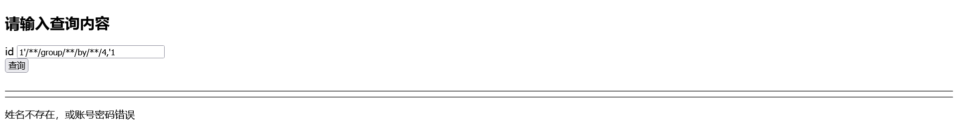先测试一下列数,1'/**/group/**/by/**/4,'1,出现报错,说明列数为3