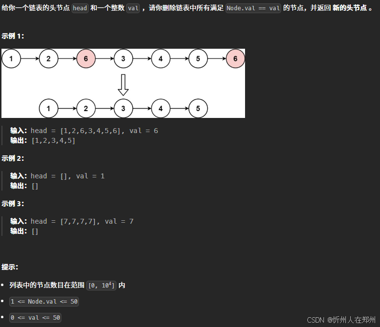 - 需要注意的一点是:不能直接使用头节点(虚拟头节点)来作为遍历节点 ,需要创建一个临时新的节点来替代头节点进行链表遍历,因为最终需要返回链表,所以头节点(虚拟头节点)的指针域不能被修改(返回的就是头节点,根据头节点来找到删除后的结果链表)。