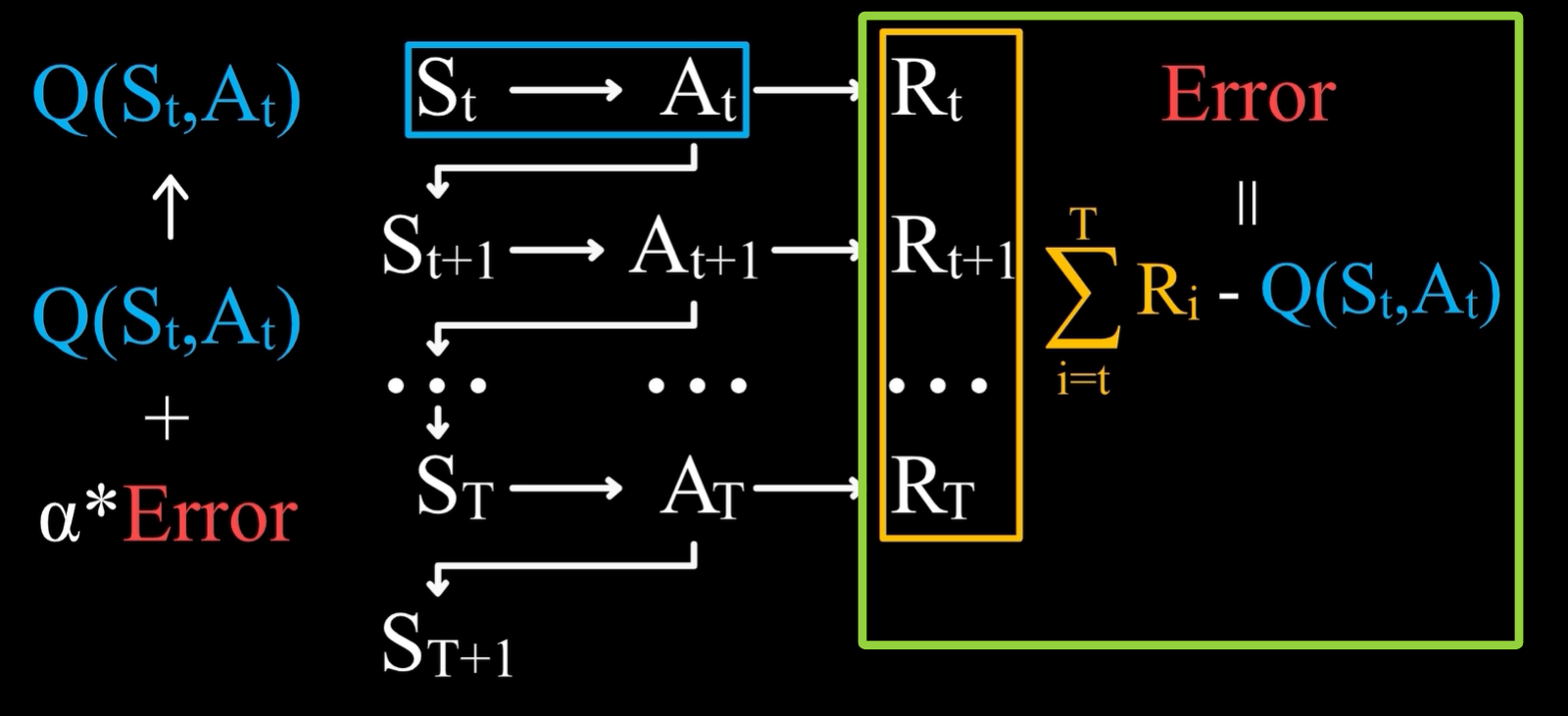 左边的红色矩形框:Q(St,At) 代表在 St 状态下,采取At行动后,产生的价值Rt的估计,那么旧估计的误差自然就是旧估计Q(St,At) - t 时刻后所有奖励Rt。 - 针对上图中左边的红色矩形框,问题在于如何表示误差Error