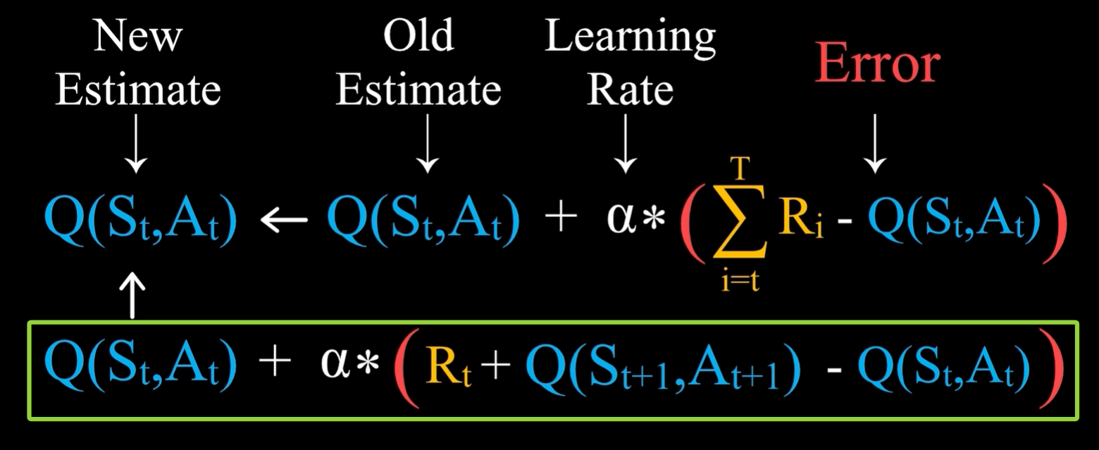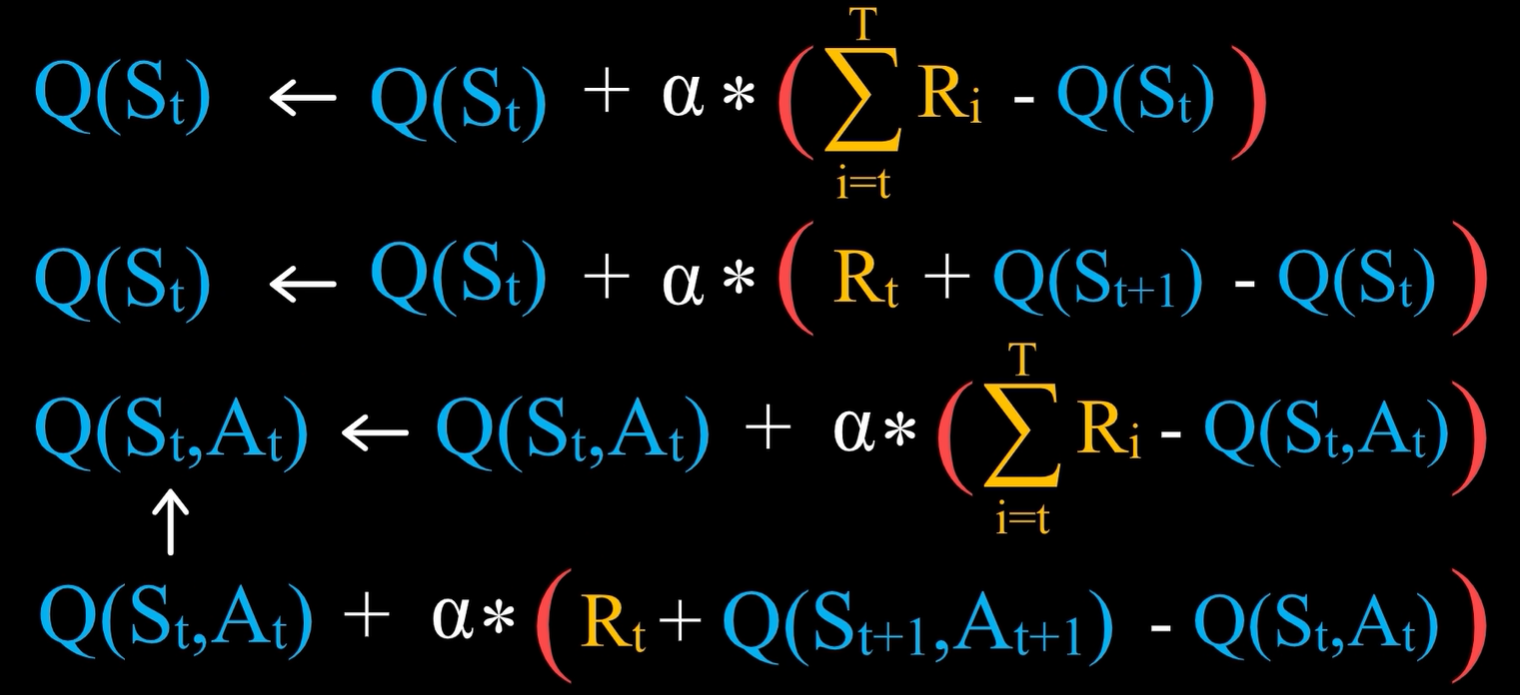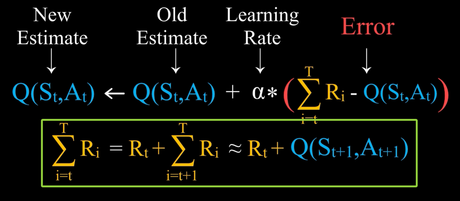 - 从t时刻开始直到游戏结束所获得的奖励之和,等于Rt加上从t+1时刻开始直到游戏结束所获得的奖励之和,后面这一项可以用已经有的估计值来替代实际值,即Q(St+1,At+1)