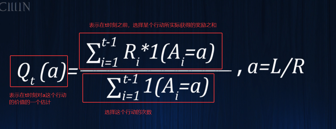 显然右边的老虎机是最优的选择,但是实际事先不知道这两个行动实际的价值,所以只能进行一个估计。下面需要对这两个老虎机进行尝试,利用实际获得的奖励来估计价值,最简单的方法就是用奖励的平均值作为期望值的估计,因此有如下的行动价值的估计表达式: