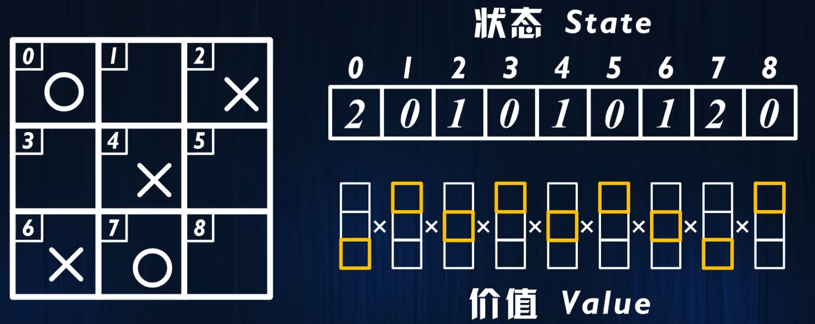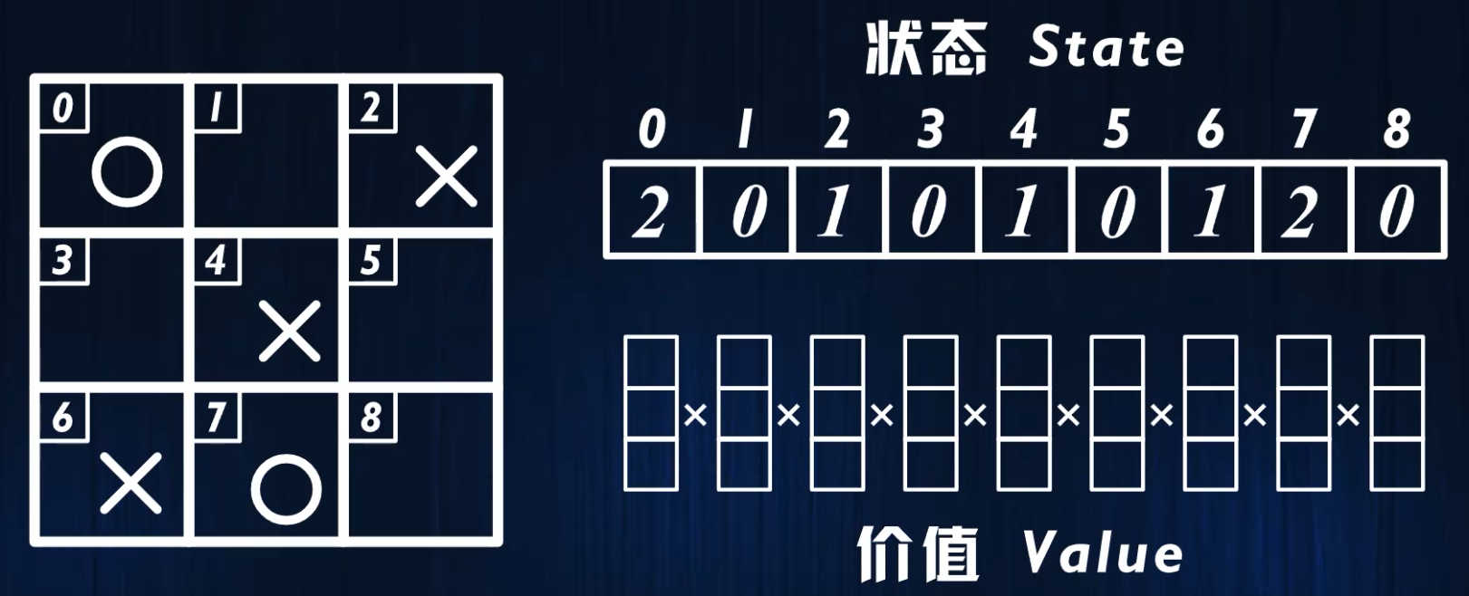 例如下面这个状态的价值,就存储在价值矩阵当中坐标为[2,0,1,0,1,0,1,2,0]的位置