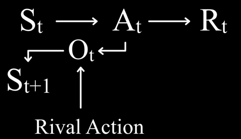 ε-Greedy的策略,现在可以选择去学习价值函数,那么行动就应该是选择能够进入价值最高的状态那一个,但这里存在一个问题,玩家进入什么状态不仅仅是由玩家自己的行动决定的,还取决于对手的行动,所以要依据价值来决定行动的话,玩家需要对对手的行动有一个预测。需要能够学习一种能够直接指导行动,数量又比较少的价值,在棋牌类游戏中,引入新的概念,Outcome即Afterstate,表示玩家行动的后果对于对手来说是一种状态。