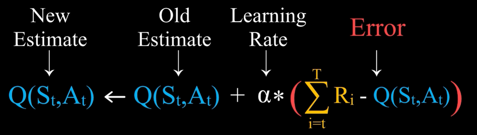 即在St状态下,采取了At这一行动之后,直到游戏结束,将实际得到的奖励之和减去旧估计值,就得到了误差。