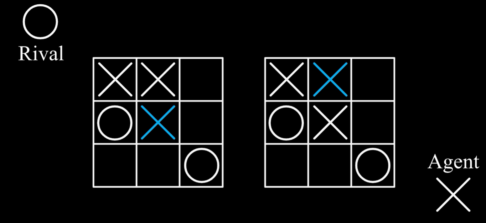 - 下图中,在第一个棋盘中,X玩家做出行动之后,在第二个棋盘的情况下,O玩家需要做出行动,因此第二个棋盘对于O玩家来说就是状态 ,但是对于X玩家来说并不是状态,将其称为后果 ,也就是X玩家做出一个行动之后导致的后果,一个玩家的后果对于另一个玩家来说是状态,反之亦然。