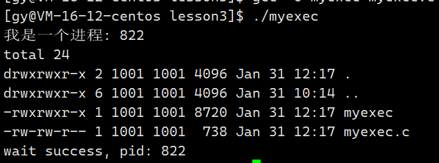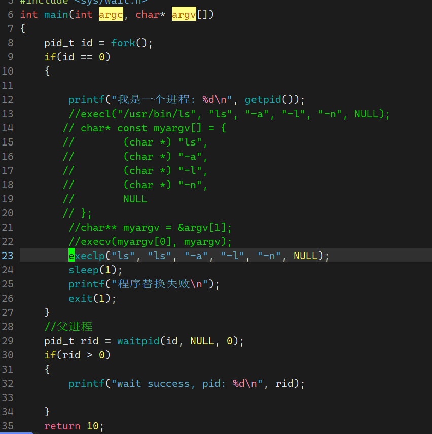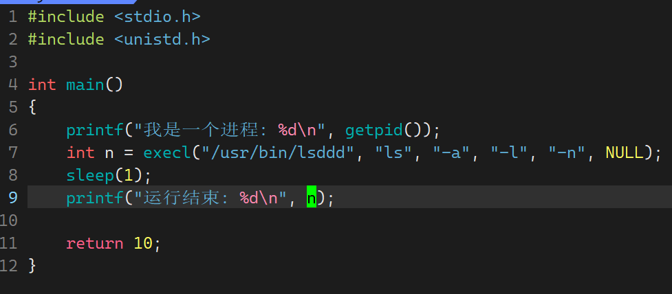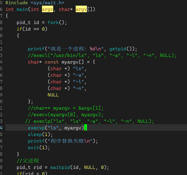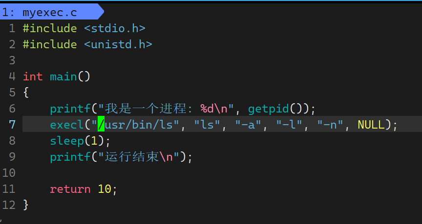 "/usr/bin/ls"路径下的ls -a -l -n程序- 因为程序替换了,进程已经执行另一个程序代码了,所以后续我们自己写的代码没有了 ,不会再执行我们自己写的代码