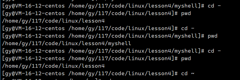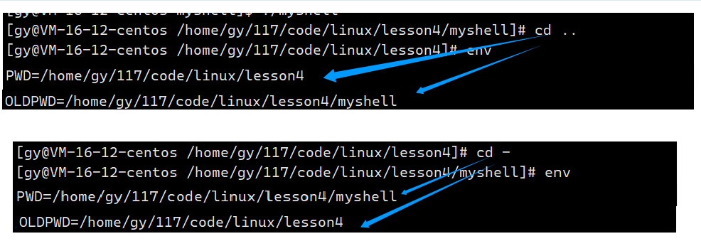 chdir(gargv[1])即可,跟的是-或~时特殊处理(~:进入家目录;-:表示进入上一次目录);当gargc == 1,说明cd后面没有跟目标路径,直接回到家目录 - 处理~和-,当为 ~时,直接进入家目录;当为-时,我们需要使用getenv函数获取oldpwd,pwd和oldpwd不会自动根据进程而自动实时更新,都是需要我们自己来更新的 ,所以我们一般不使用getenv来获得当前工作路径参数,而是使用系统调用来getcwd来直接获取当前进程所处路径