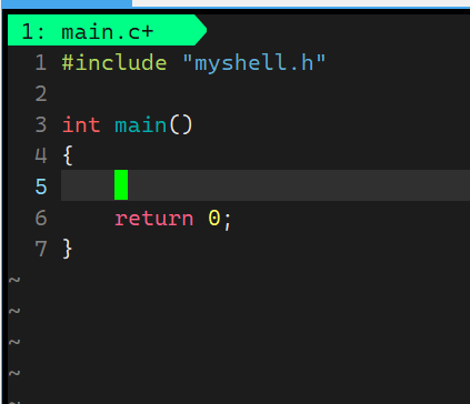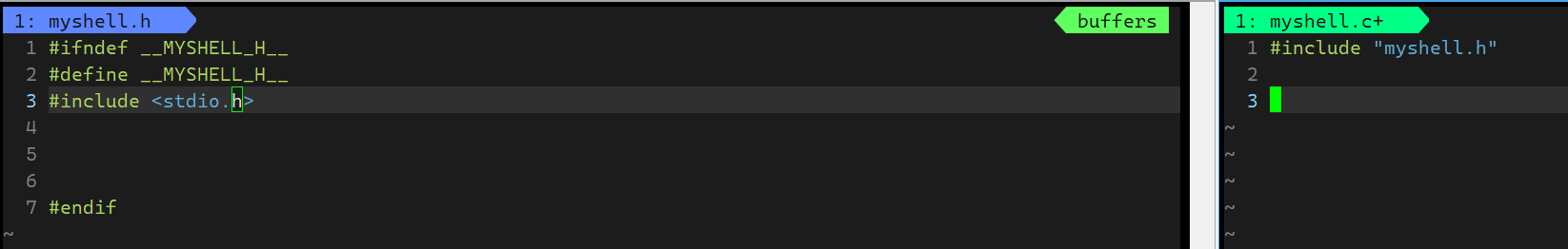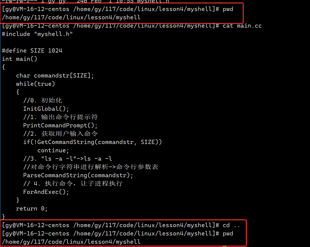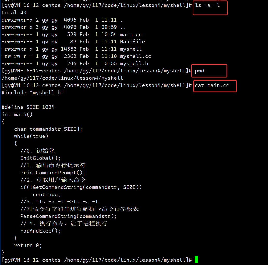 - 创建三个文件,main.cc负责上层调用,myshell.cc命令行相关实现代码,myshell.h函数声明