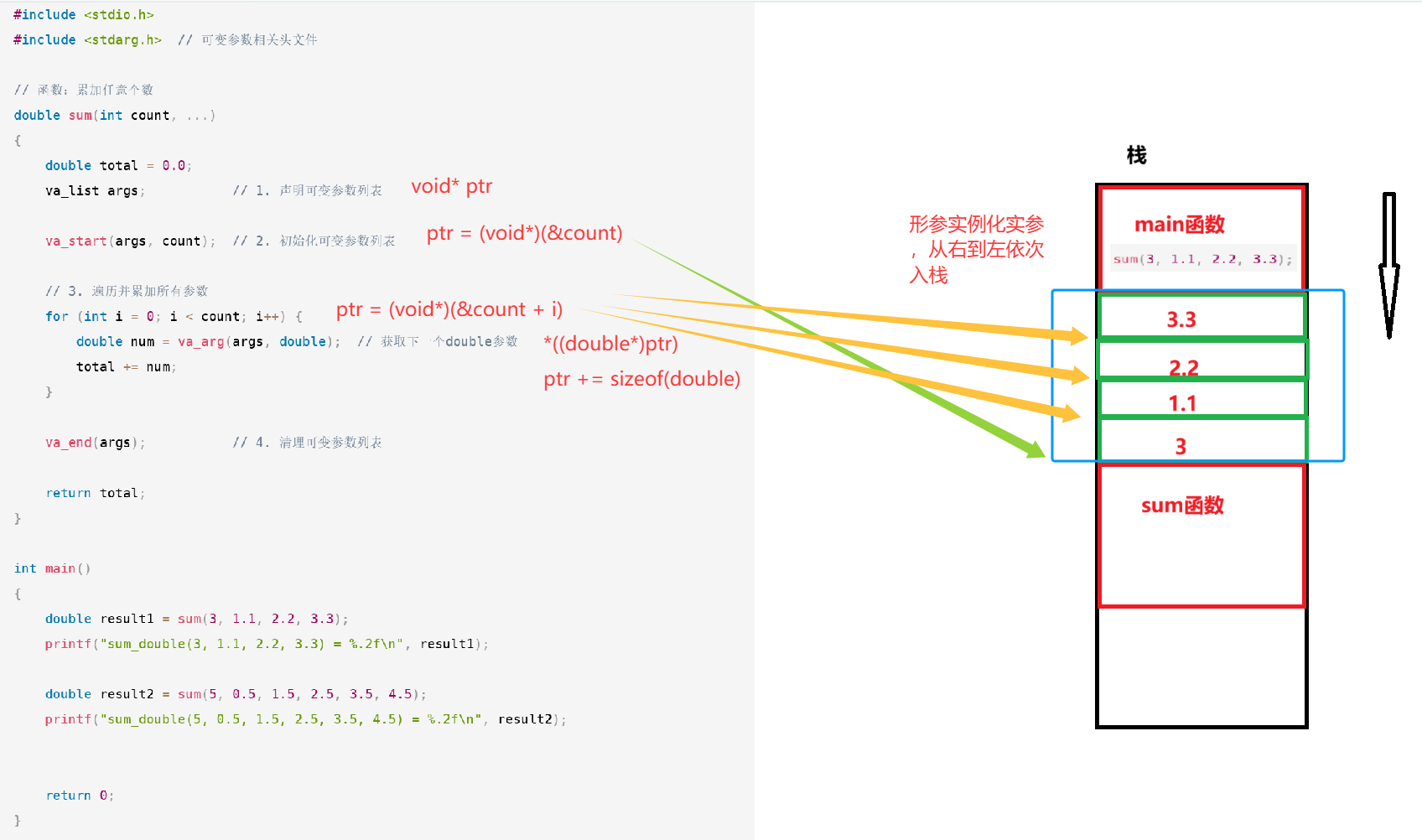 cpp#include <stdio.h> #include <stdarg.h> // 可变参数相关头文件 // 函数:累加任意个数 double sum(int count, ...) { double total = 0.0; va_list args; // 1. 声明可变参数列表 va_start(args, count); // 2. 初始化可变参数列表 // 3. 遍历并累加所有参数 for (int i = 0; i < count; i++) { double num = va_arg(args, double); // 获取下一个double参数 total += num; } va_end(args); // 4. 清理可变参数列表 return total; } int main() { double result1 = sum(3, 1.1, 2.2, 3.3); printf("sum_double(3, 1.1, 2.2, 3.3) = %.2f\n", result1); double result2 = sum(5, 0.5, 1.5, 2.5, 3.5, 4.5); printf("sum_double(5, 0.5, 1.5, 2.5, 3.5, 4.5) = %.2f\n", result2); double result3 = sum(1, 99.9); printf("sum_double(1, 99.9) = %.2f\n", result3); double result4 = sum(0); printf("sum_double(0) = %.2f\n", result4); double result5 = sum(4, 1, 2.5, 3, 4.7); printf("sum_double(4, 1, 2.5, 3, 4.7) = %.2f\n", result5); return 0; }