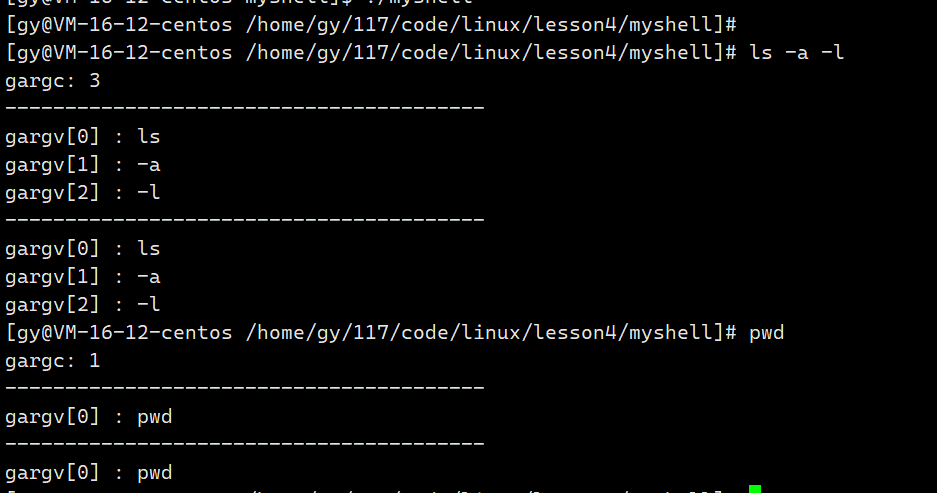 - 命令行提示符包括[]、用户名(gy)、主机名(@VM-16-12-centos)和当前所在的工作路径,再包括一个$符号