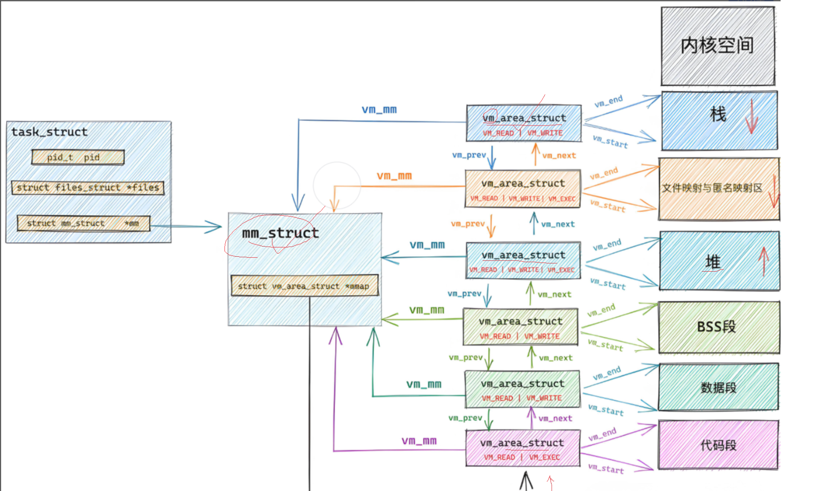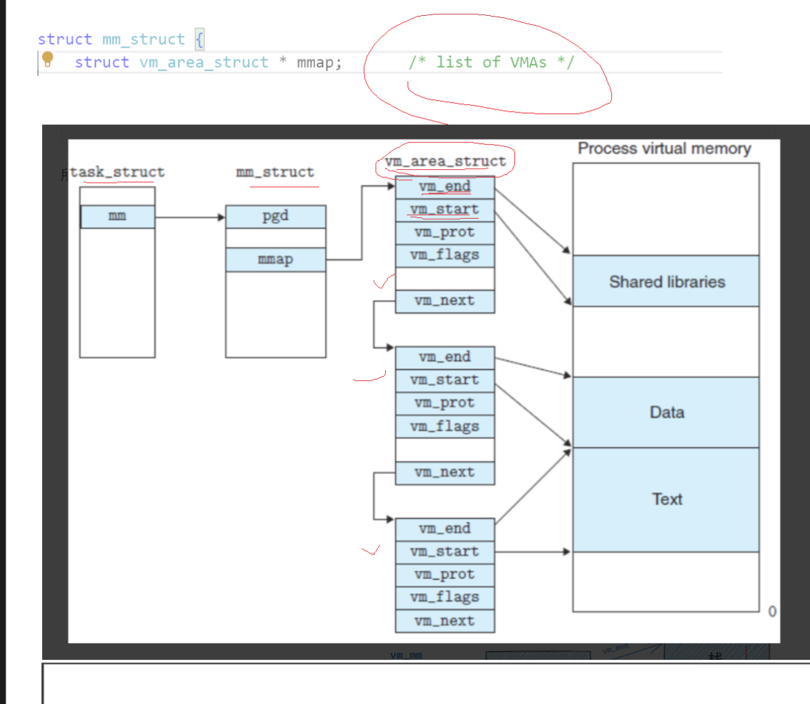 虚拟内存同样,所有对进程描述,mm_struct会有 int begin int end,这就叫做区域划分了,只需要知道起始与末位置即可,而管理虚拟内存,即将这些描述通过链表组织起来