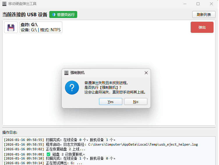 - 自动记录所有操作,包括扫描设备、弹出尝试、进程结束、脱机 / 上线等,同时标注时间戳,方便排查问题。日志会同步保存到本地文件(eject_log.txt),可随时查看。