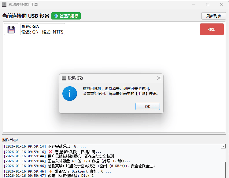 - I/O 活动检测:执行强制脱机前,会检测磁盘是否有读写活动,持续 1.5 秒,若检测到数据传输,会弹窗警告,避免强行脱机导致数据丢失。