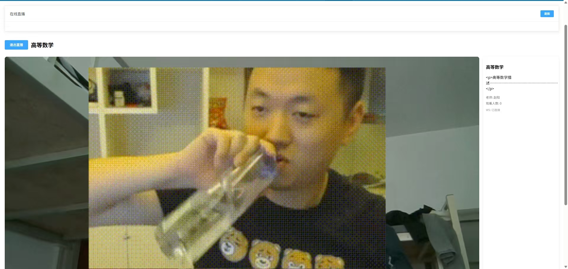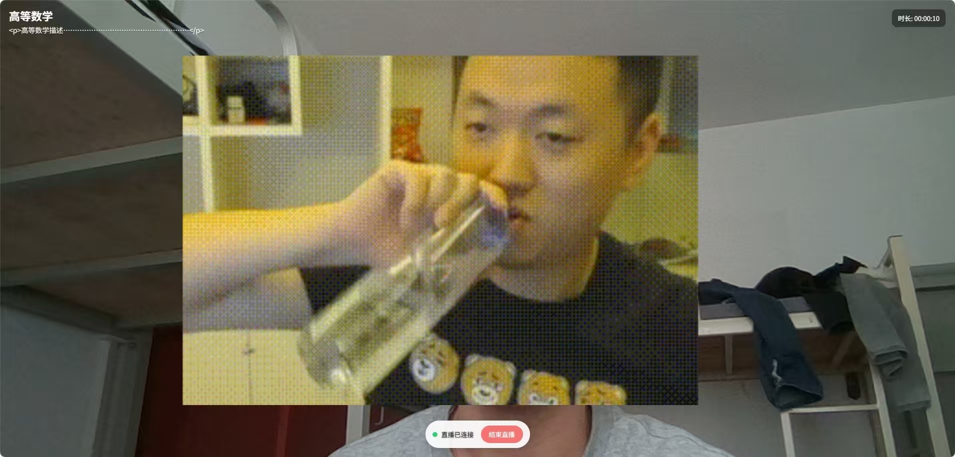 在管理端,主播通过填写直播信息并点击开播按钮,系统会初始化媒体流采集、建立 WebRTC 连接,并开始视频录制。开播成功后,主播可以看到自己的直播画面和相关统计信息,同时系统会将直播状态同步到所有用户端。