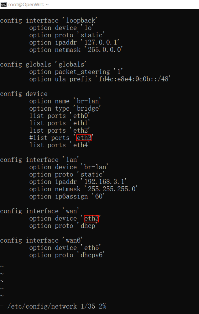如图2所示,将lan4口配置成wan口,使用#注释list ports 'eth3',将wan口的eth5设置成eth3,设置完之后保存使用reboot命令重启生效,lan4口即可当wan口使用;