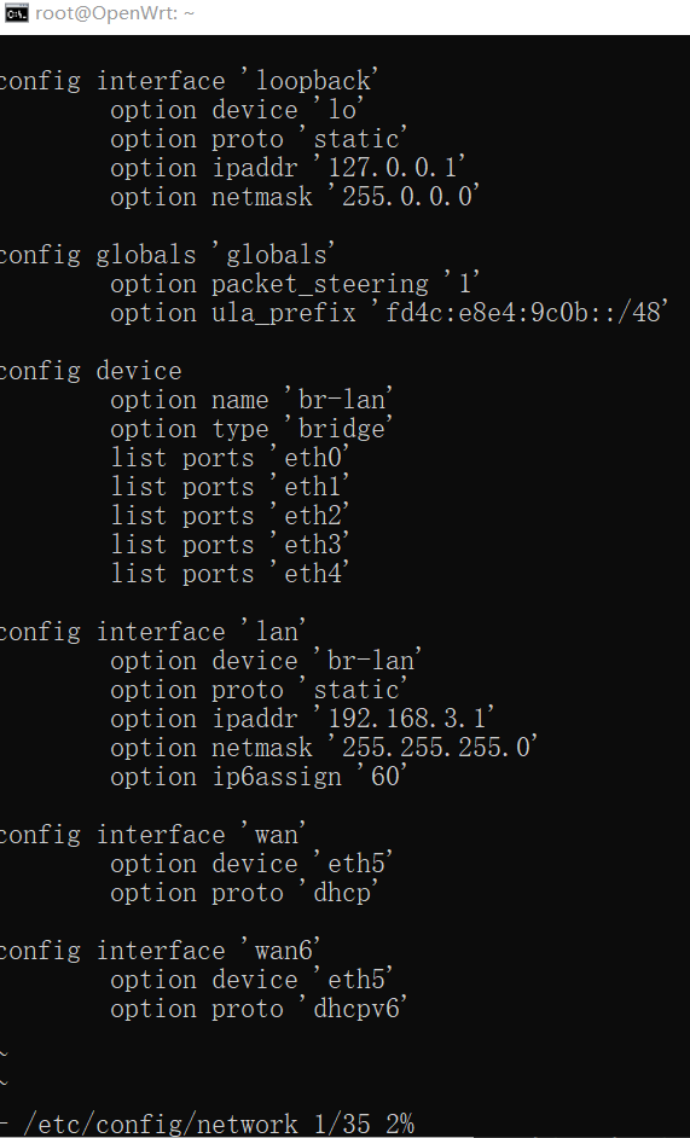 如图3所示,将lan2口的配置改成list ports 'eth5',设置完之后保存使用reboot命令重启生效,wan口即可当成lan2口使用;