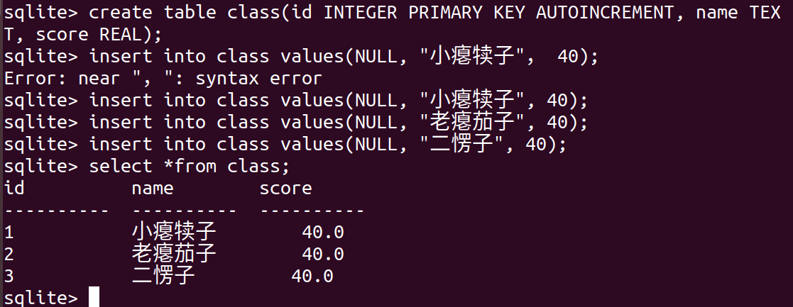 创建表时,在列名后添加PRIMARY KEY AUTOINCREMENT(可以按Tab自动补齐)