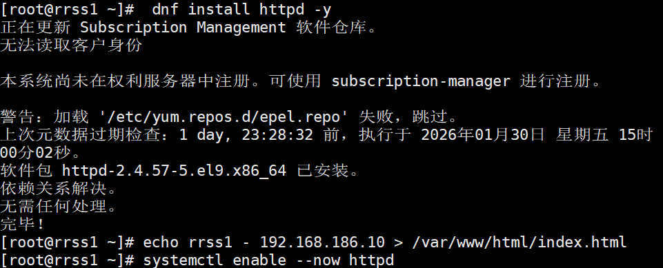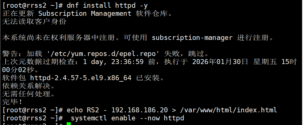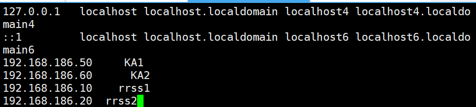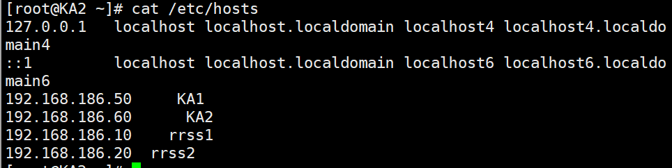root@rs1 \~\]# vmset.sh eth0 xxx.xx.xx.xx rs1 \[root@rs1 \~\]# dnf install httpd -y \[root@rs1 \~\]# echo RS1 - xxx.xx.xx.xx \> /var/www/html/index.html \[root@rs1 \~\]# systemctl enable --now httpd rrss1   rrss2   #测试:   #设定ka1和ka2 \[root@KA1 \~\]# vmset.sh eth0 xx.xx.xx.xx KA1 \[root@KA2 \~\]# vmset.sh eth0 xx.xx.xx.xx KA2   #设定本地解析 \[root@KA1 \~\]# vim /etc/hosts 127.0.0.1 localhost localhost.localdomain localhost4 localhost4.localdomain4 ::1 localhost localhost.localdomain localhost6 localhost6.localdomain6 xx.xx.xx.xx KA1 xx.xx.xx.xx KA2 xx.xx.xx.xx rrss1 xx.xx.xx.xx rrss2  \[root@KA1 \~\]# for i in 60 10 20 \> do \> scp /etc/hosts xx.xx.xx.xx.$i:/etc/hosts \> done  #在其他主机中查看/etc/hosts  #在ka1中开启时间同步服务 \[root@KA1 \~\]# vim /etc/chrony.conf 26 allow 0.0.0.0/0 29 local stratum 10  \[root@KA1 \~\]# systemctl restart chronyd \[root@KA1 \~\]# systemctl enable --now chronyd  #在ka2中使用ka1的时间同步服务 \[root@KA2 \~\]# vim /etc/chrony.conf pool 192.168.186.50 iburst  \[root@KA2 \~\]# systemctl restart chronyd \[root@KA2 \~\]# systemctl enable --now chronyd  \[root@KA2 \~\]# chronyc sources -v