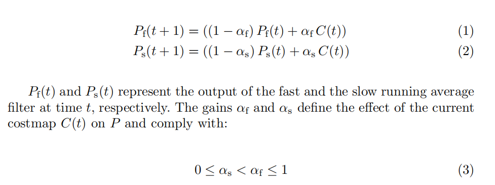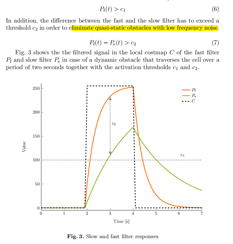 1)使用快滤波器Pf和慢滤波器Ps,当栅格有动态物体时占用概率会增大,Pf会快于Ps,而对于静态或无障碍物两者几乎相等