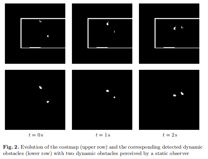 2)由上一步得到动态和非动态的二值栅格图,进行腐蚀膨胀和聚类可得到动态物体,如白色块