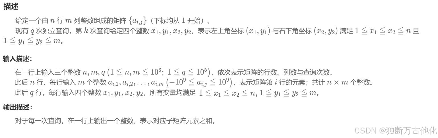 第一步:预处理出来一个前缀和矩阵数组dp[ i ][ j ],表示从[ 1 , 1 ]位置到[ i , j ]位置这段区间里面所有元素的和。而计算dp[ i , j ]的值需要将区间进行分割计算。
