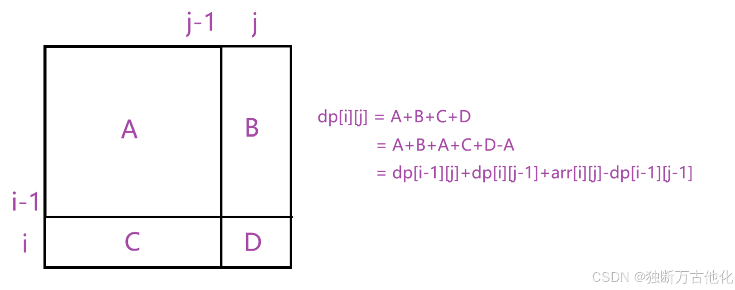 dp[ i ][ j ]的值为ABCD四块区域的和,单独的B和C不好求,但是如果将A和B,A和C放在一起求,正好就是前缀和数组中的值,此时会多求一块A区域的值,因此再单独减去即可。