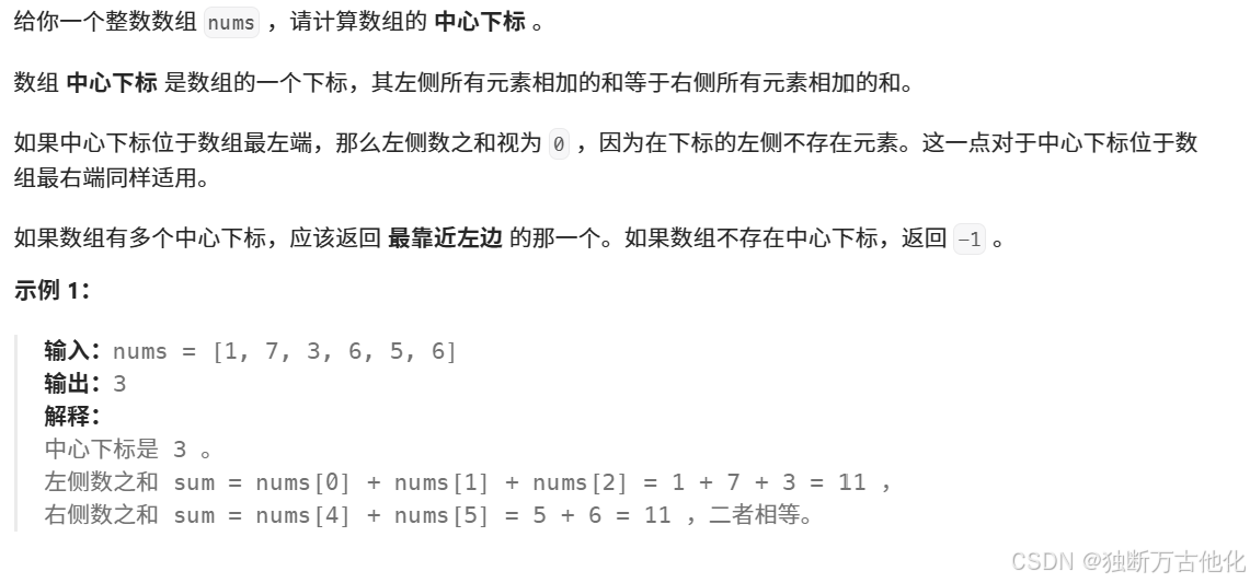 - 从题中数组的中心下标定义可知,中心下标左侧的和等于中心下标右侧的和,也就是区间[ 0 , i-1 ]的和等于[ i+1 , n-1 ]。