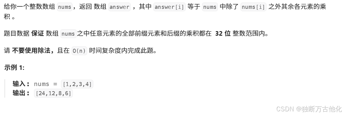 - 分别为前缀积和后缀积数组。而前缀积f[ i ]表示的为[ 0 , i-1 ]区间内所有元素的乘积,后缀积g[ i ]表示[ i+1 , n-1 ]区间内所有元素的乘积。