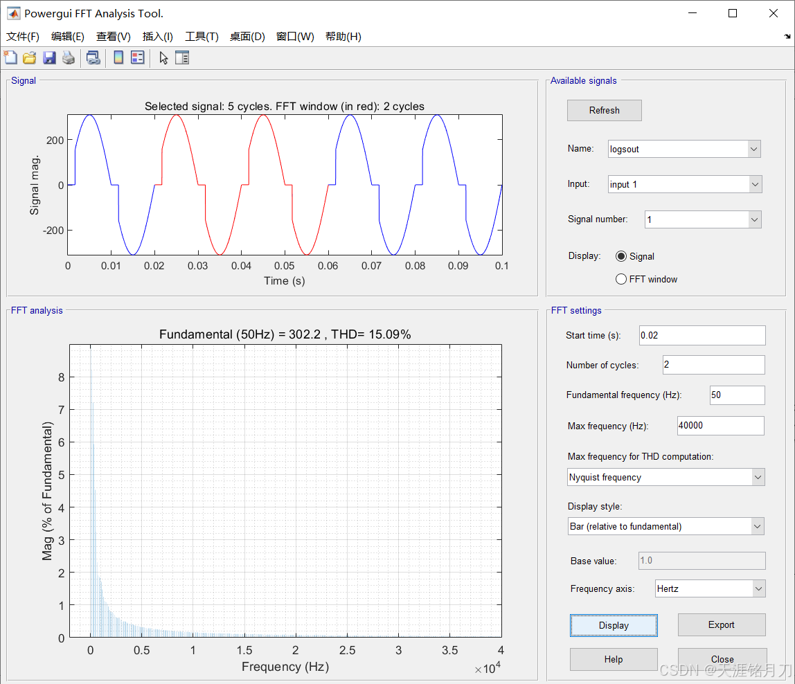Max frequency for THD computation:用于计算THD的最大频率,选择Nyquist frequency意味着在THD计算中考虑的最高频率将为采样频率的一半(即尼奎斯特极限)。这样可以确保在谐波分析中不包含混叠效应;也可选择Max Frequency(Hz)。