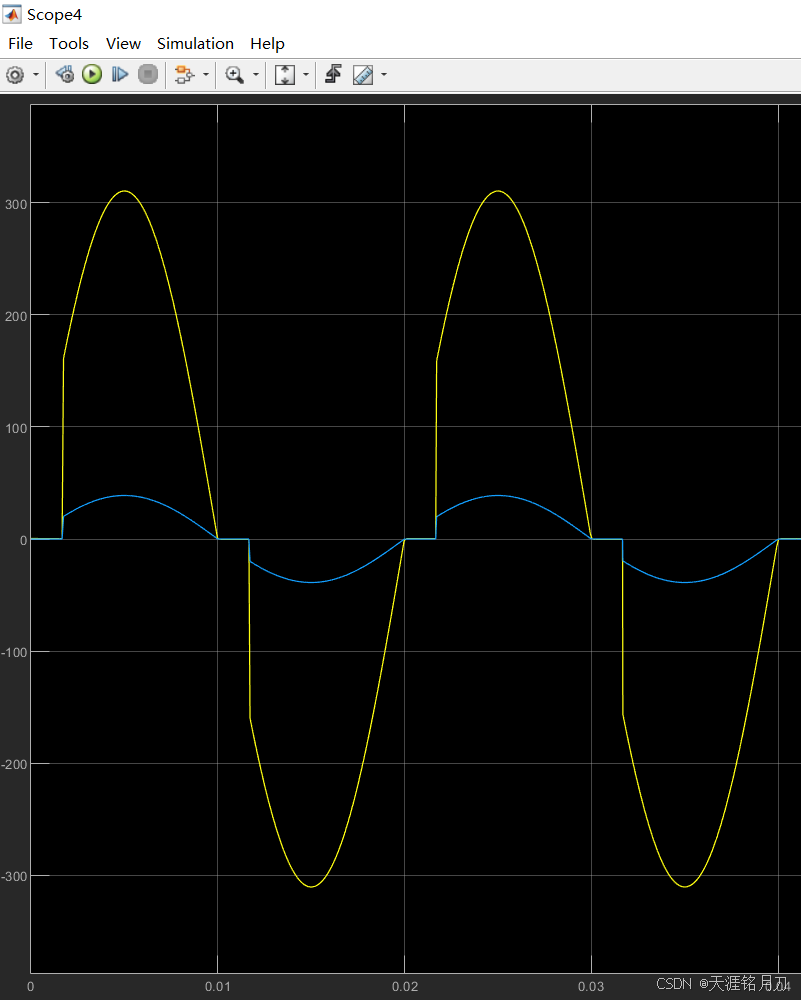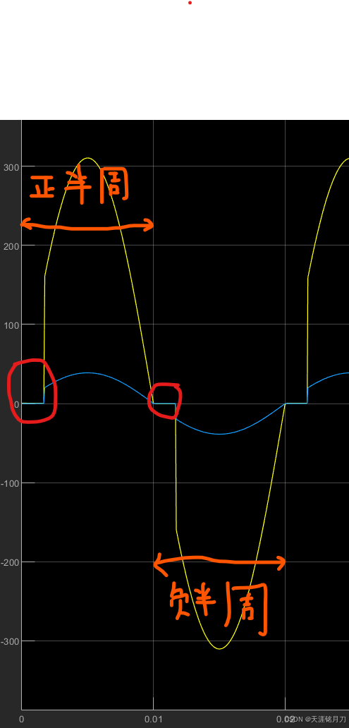 根据仿真结果可直,正半轴导通角为30°,负半轴导通角也为30°。