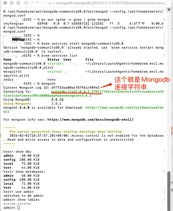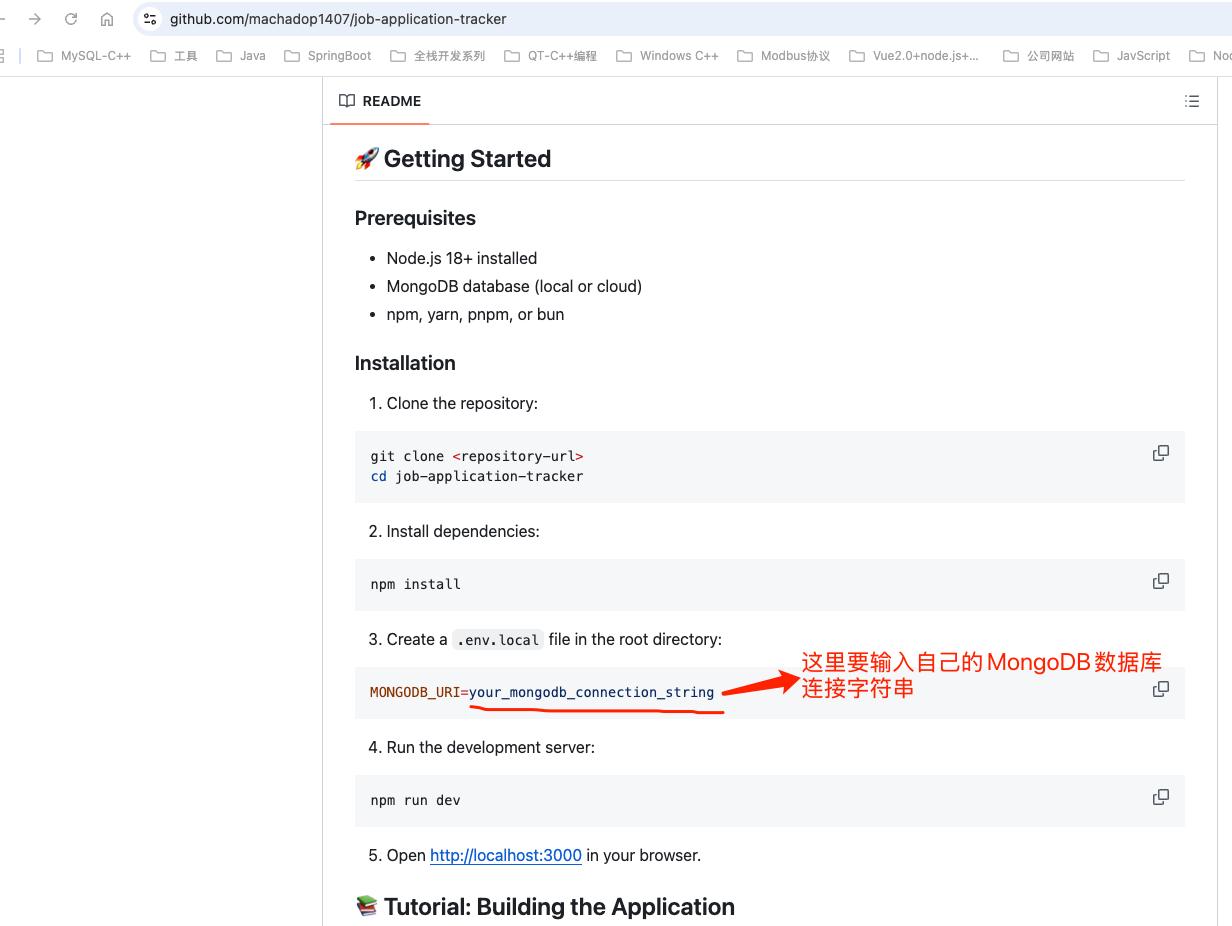 最近在学习NextJS 16 Full Course 2026 | Build and Deploy A Production Ready Job Application Tracker w/ MongoDB 这个视频,从Github上面下载了https://github.com/machadop1407/job-application-tracker源代码后解压缩,首先在我的MacOS Mini4主机上面安装了MongoDB 8.0,并且按照MongoDB官网在 macOS 上安装 MongoDB Community Edition成功安装了MongoDB 8.0社区版。