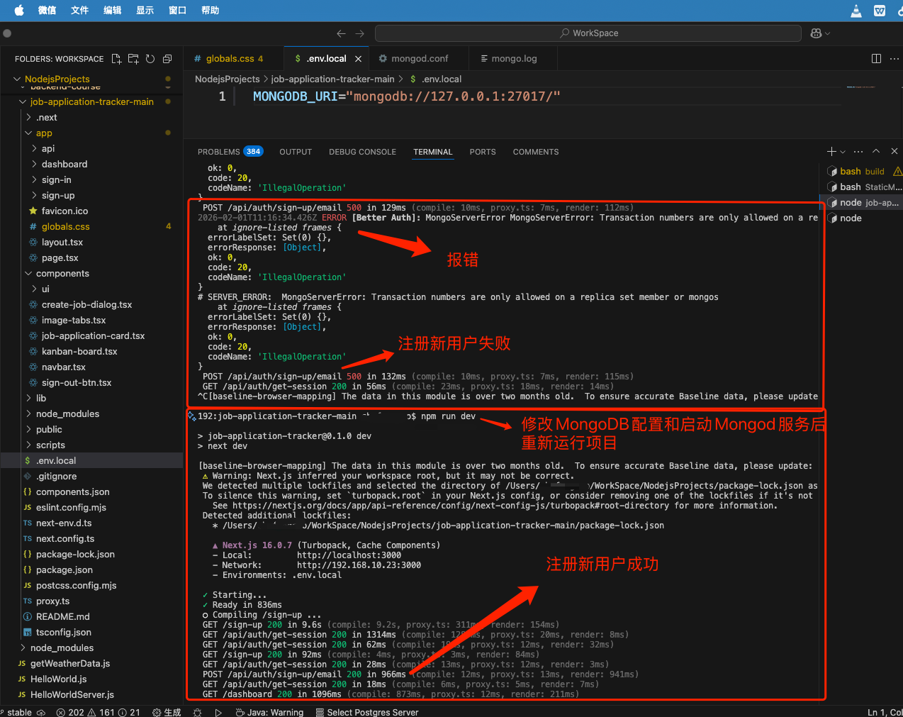 但是问题时,我安装了MongoDB 8.0社区版,并且运行了MongoDB后台服务后,下载了https://github.com/machadop1407/job-application-tracker项目源代码,并且按照下面给的方法配置了MongoDB数据库连接字符串,并npm install安装好相关依赖,并且npm run dev启动项目后,打开Chrome浏览器输入http://localhost:3000/后有登陆和注册页面,但是注册账号时报如下错误,没法注册新用户。