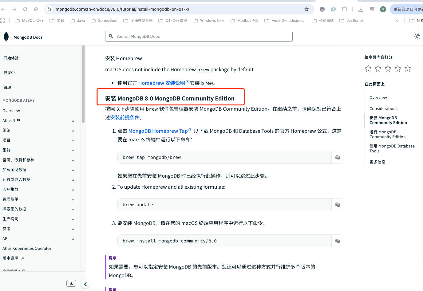 - 1.点击 MongoDB Homebrew Tap 以下载 MongoDB 和 Database Tools 的官方 Homebrew 公式,这需要在 macOS 终端中运行以下命令: