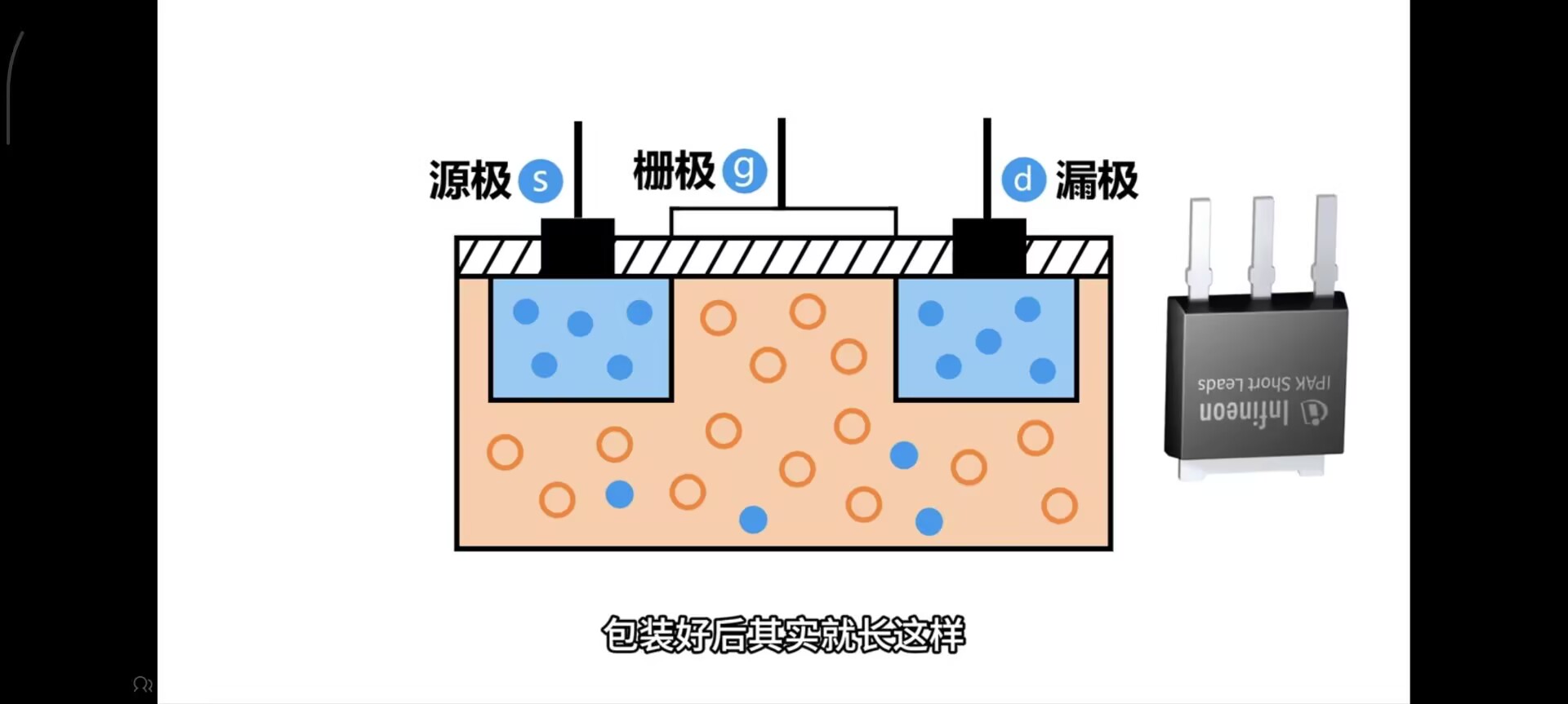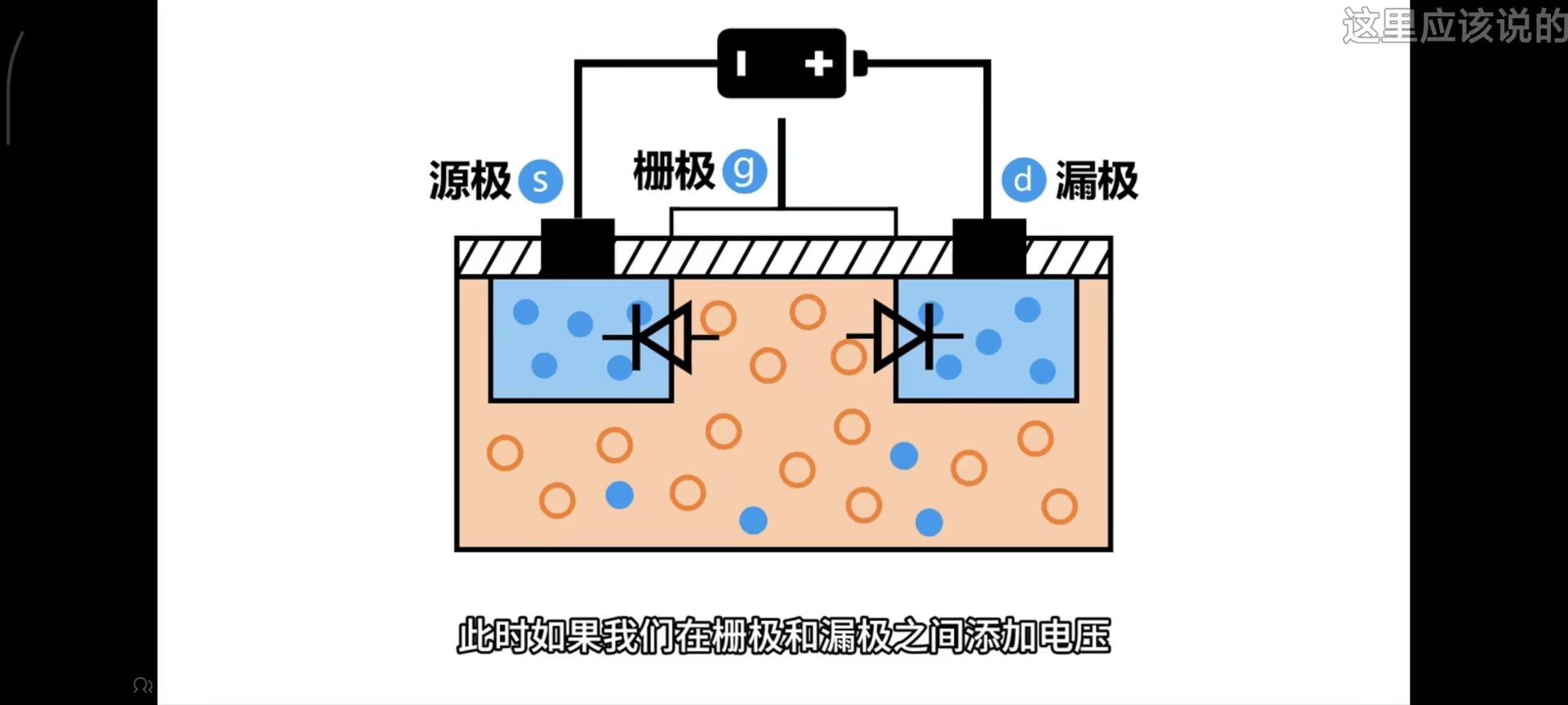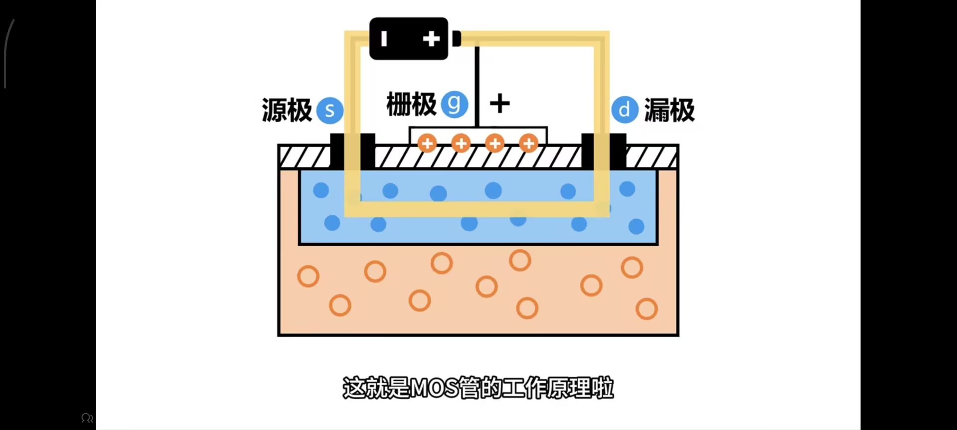 由于右侧没有导通,左侧也不会导通 - 当栅极接入电源正极时,电子被吸引到上面,形成完整回路