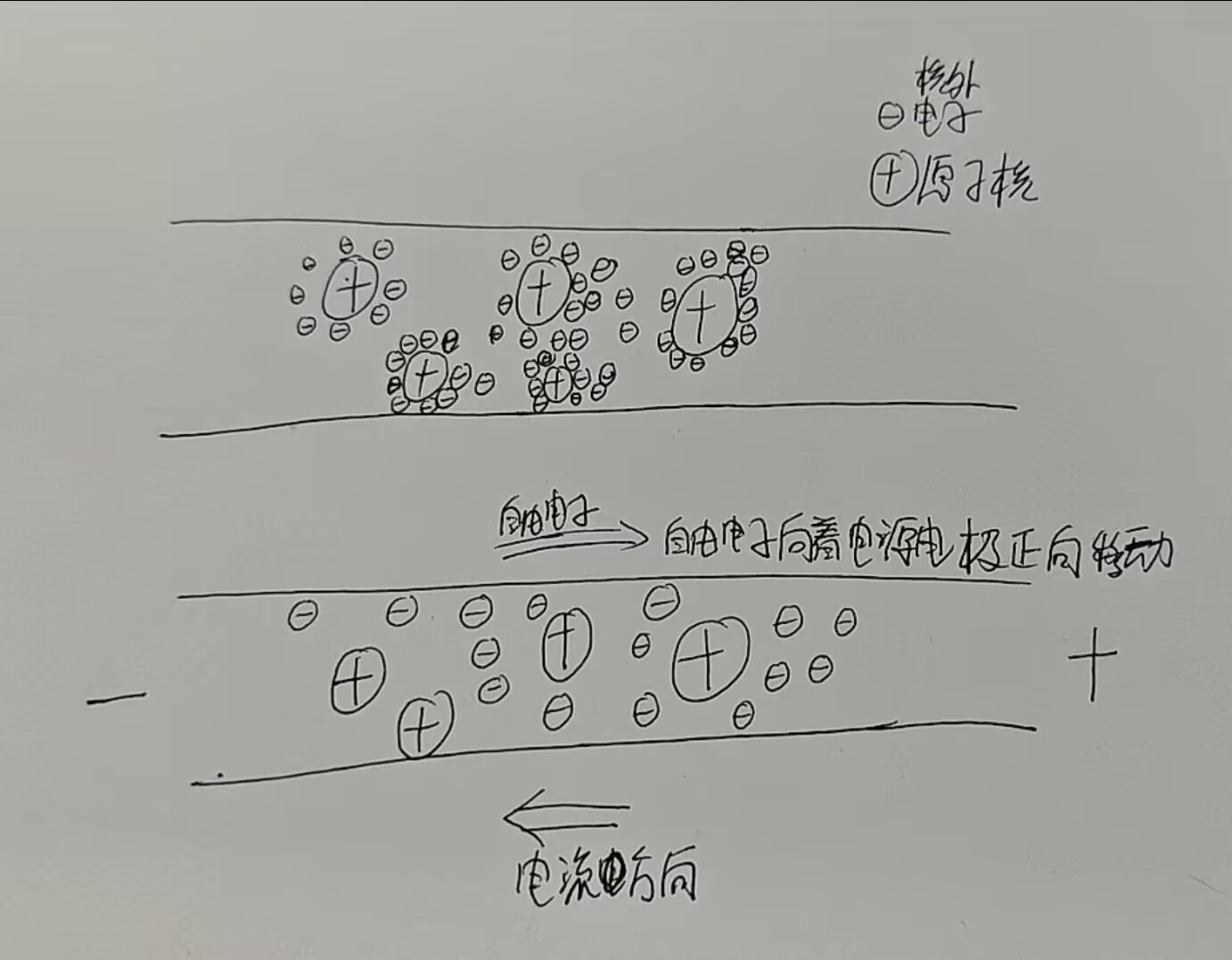 电源负极输入电子,推动电子向右移动