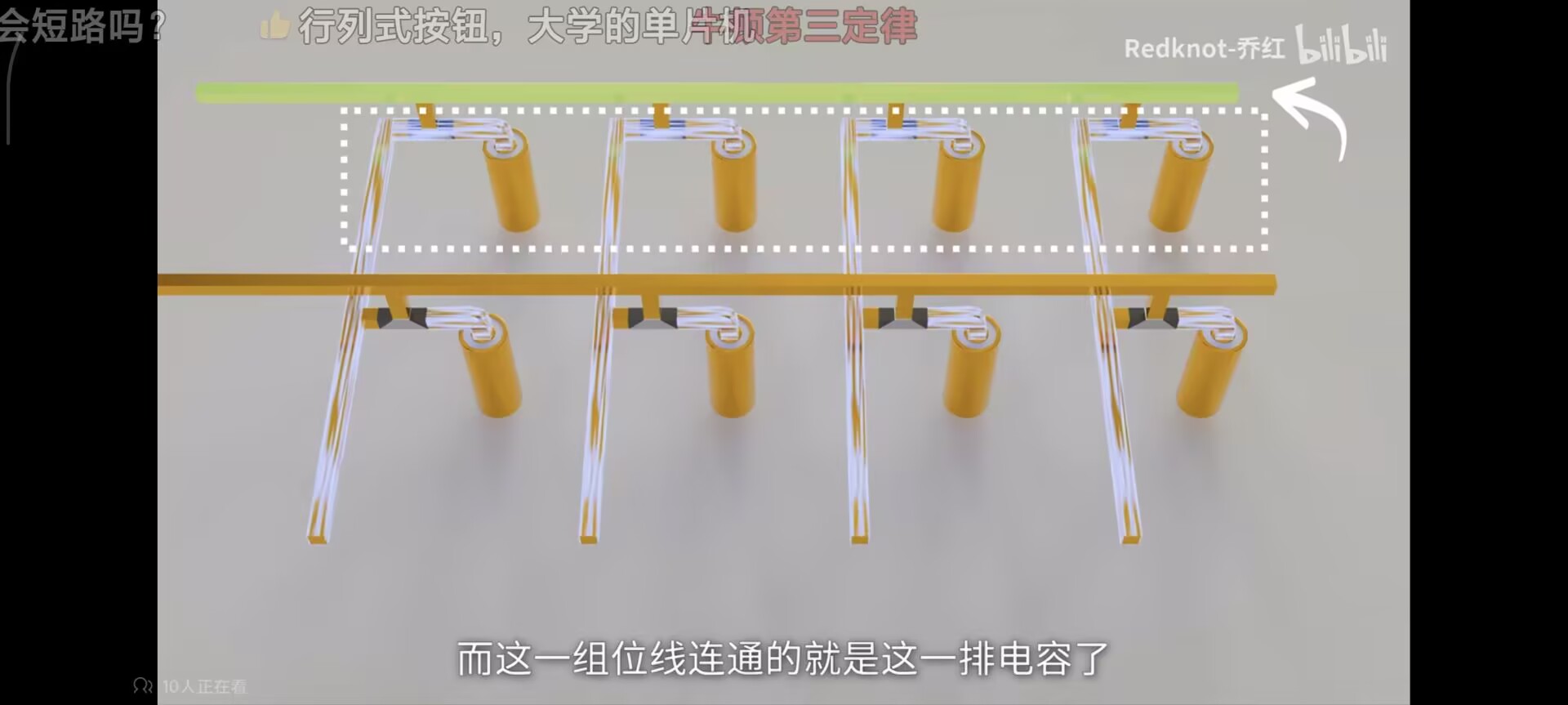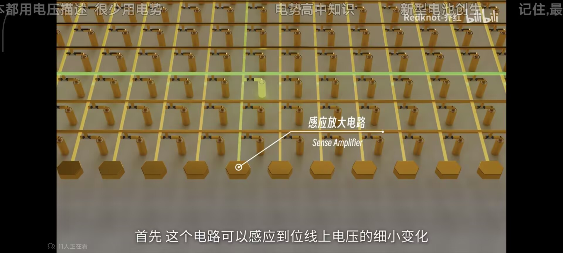 当一条字线被电压激活时,一整行的8192个电容就会被接入到对应的位线上去