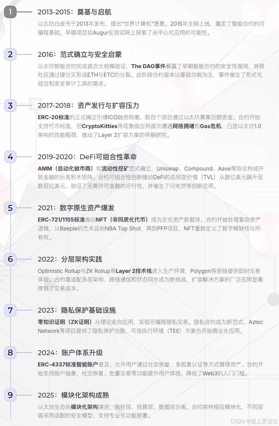 我记得2015年刚接触以太坊的时候,大家讨论最多的是"智能合约到底能不能用"。那时候真的就是摸着石头过河(早期写合约的时候工具少、文档稀,单靠看黄皮书,调字节码用纯文本编辑器,部署合约得自己拼 bytecode、用命令行和 geth 交互),现在谁能想到代码真的能成为合约呢?结果2016年的The DAO事件就像一盆冷水,让大家清醒地认识到:代码能成为合约,但代码也会有漏洞。