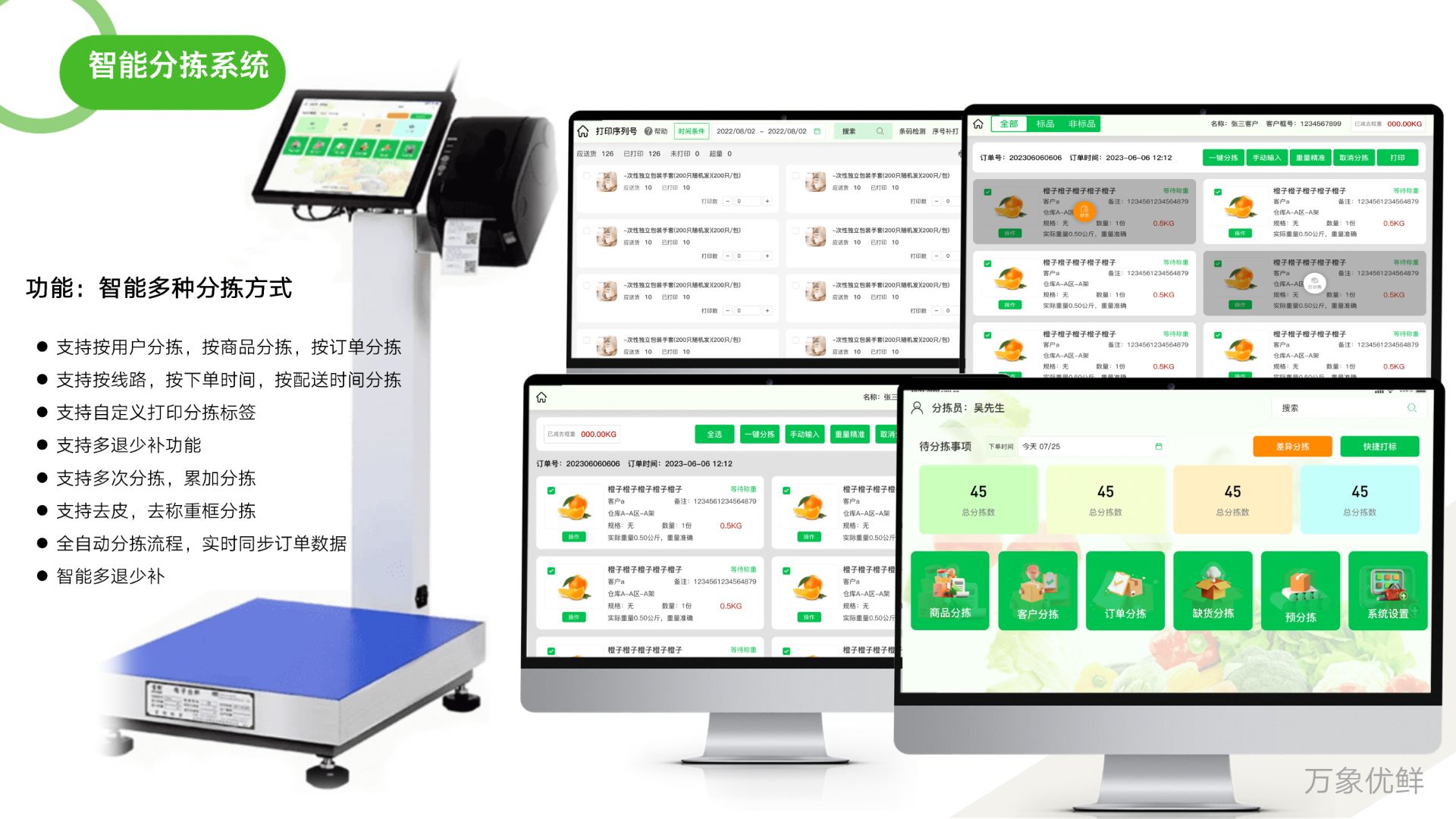 订单审核通过后,就会同步到仓库的分拣环节,这一步是生鲜配送的关键,毕竟生鲜易损耗,还不能错发漏发,万象系统靠智能工具帮分拣员提高效率。首先,系统会根据订单类型、配送区域、配送时间,把订单拆分到对应的分拣工位,比如同一小区的订单分到一个工位,早上要送的订单优先分拣。