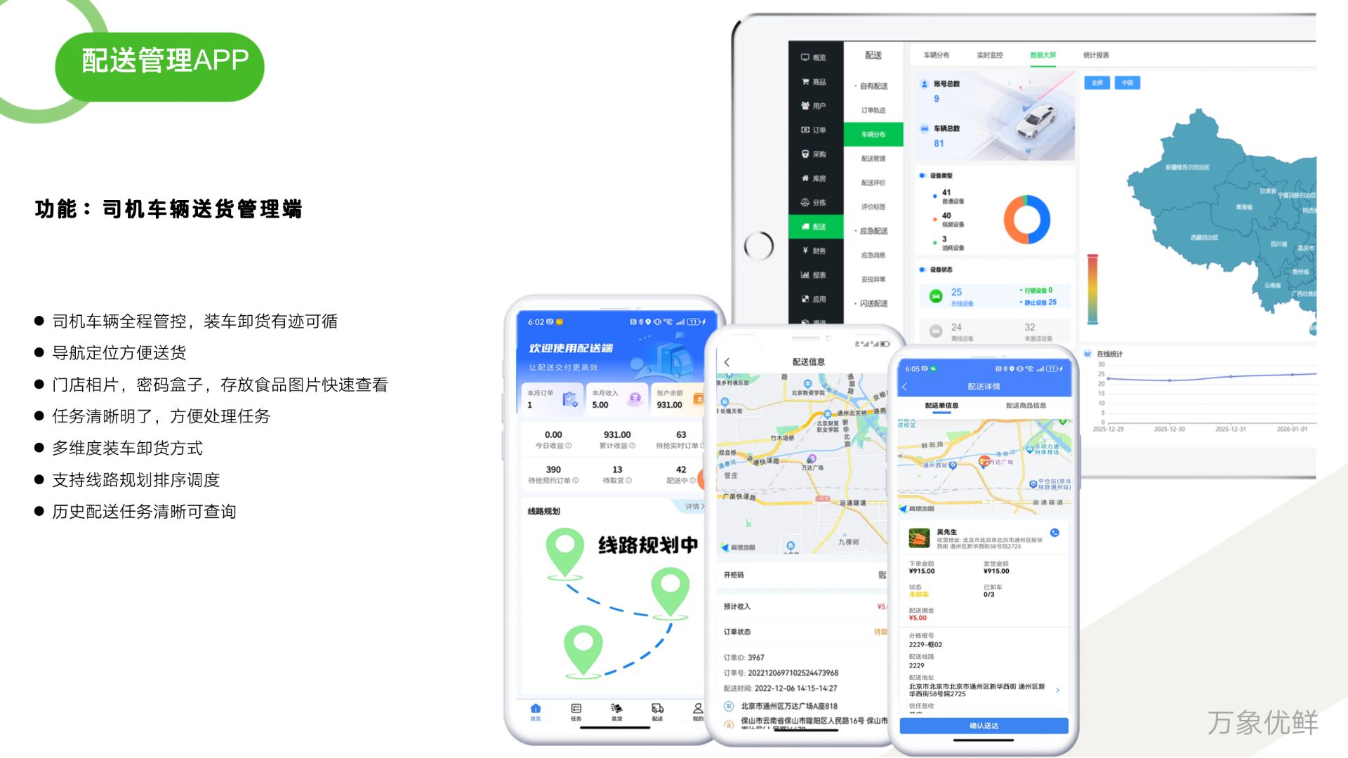分拣完成后,就到了配送环节,万象系统的核心优势就是智能调度,能平衡配送时效和成本,还能保障生鲜新鲜。首先,系统会整合所有待配送订单,结合配送地址、商品特性(比如冷链商品需要冷藏车)、运力情况(自有骑手、第三方物流),进行最优匹配,比如冷链订单专门分配给带冷藏设备的车辆,同一区域的订单分配给同一个配送员,避免浪费运力。