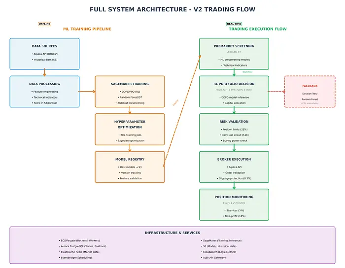 系统自主运行。每天凌晨4点,ML模型分析技术指标,生成50个候选股票的监视列表。在市场时间内,一个强化学习模型(在SageMaker上训练)决定开设哪些头寸、适当调整大小,以及何时退出。如果RL模型不可用,决策树将使用预定义的风险参数接管。