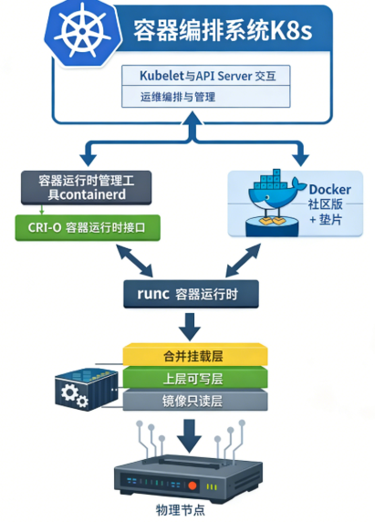 在docker中,当命令发布后,会通过镜像创建一个容器出来,(容器实质上可以理解为在内存中创建的几个进程,进程以镜像为基座只读层,在其上有upper可写层,最上边为merge挂载层)在创建容器时,容器运行时runc负责在底层内核级别对这组进程进行资源隔离,共同协作运行容器。
