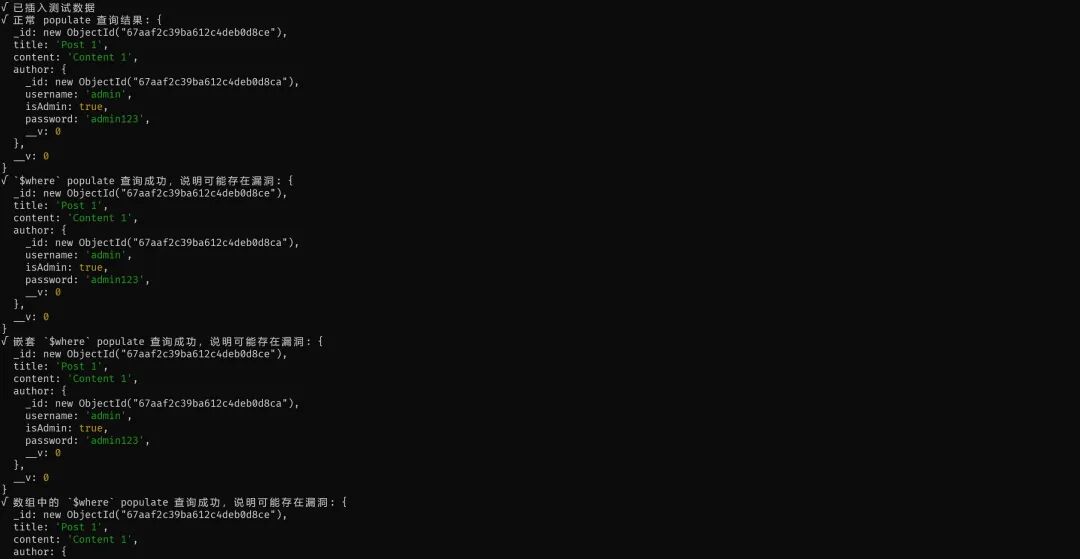 console.log("√ 嵌套 `$where` populate 查询成功,说明可能存在漏洞:", result); -