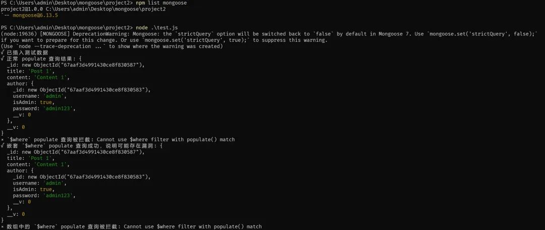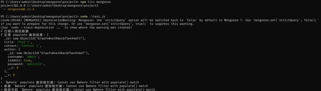 console.error("× 嵌套 `$where` populate 查询被拦截:", err.message); -