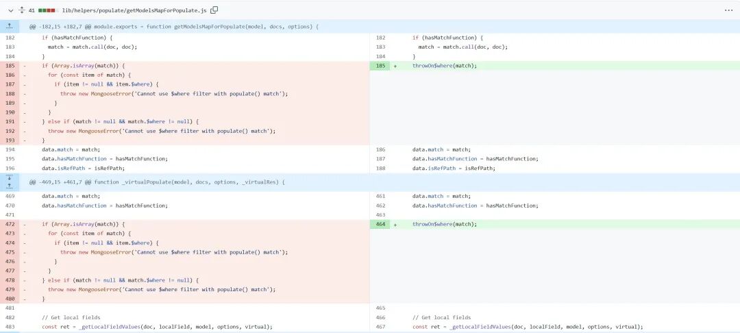| CVE-2025-23061 | 第二次修复对代码进行了重构,引入了一个单独的函数 throwOn\where。该函数接受 match 对象作为参数,并递归地检查其中是否包含 \\where 操作符。函数首先对 match 进行类型检查,如果不是对象类型则直接返回。然后遍历 match 对象的属性键,如果发现 \where 键,则抛出异常;对于嵌套的对象,函数会递归调用自身进行检查。这种递归的方式可以对任意深度嵌套的对象进行全面检查,提供了更完善的 \\where 操作符限制。同时,代码的可读性和可维护性也得到了提高。 |