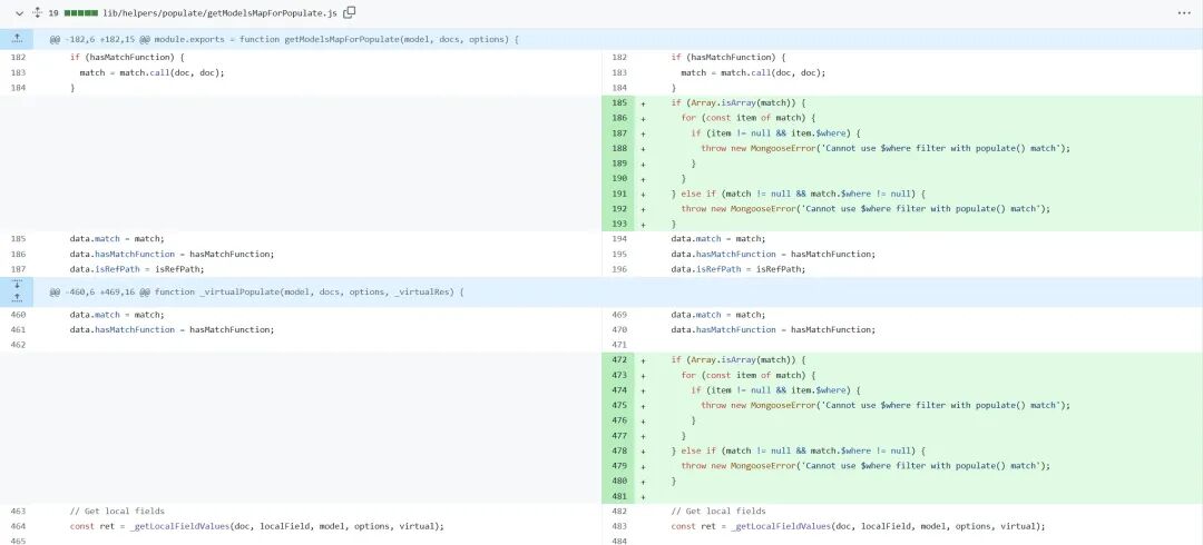 | CVE-2024-53900 | 第一次修复引入了代码来检查 match 参数是否包含 \where 操作符。代码首先判断 match 是否为数组,如果是,则遍历数组的每个元素,检查是否包含 \\where 属性;如果 match 是一个对象,则直接检查其 \where 属性。如果发现 \\where 操作符,就抛出一个 MongooseError 异常。这样可以在 populate() 查询中禁止使用 \$where 操作符,提高了安全性。但是,这种方式只能检查一层嵌套,对于更深层次的嵌套对象,可能无法完全检查到。 |